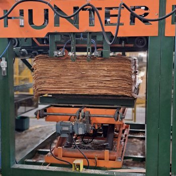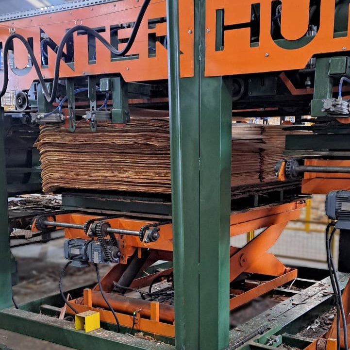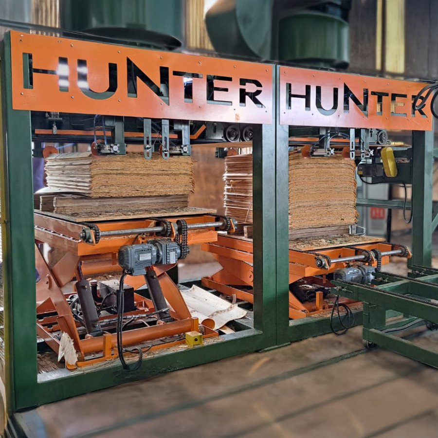 O Empilhador de Lâminas Hunter (modelos 1.4 e 2.7, disponíveis com um ou mais decks) foi desenvolvido para otimizar o processo de manuseio e organização de lâminas provenientes de tornos laminadores, garantindo aumento significativo no aproveitamento das lâminas e redução de quebras durante o fluxo produtivo.