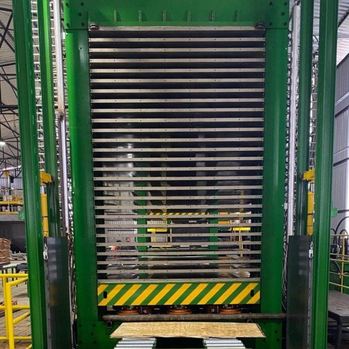 A Prensa Térmica Hidráulica é o coração da linha de produção de painéis, projetada para consolidar a estrutura do compensado através da aplicação simultânea de alta pressão e temperatura controlada. Com engenharia robusta e tecnologia de ponta, este equipamento é ideal para indústrias que buscam excelência tanto em compensados navais/comuns.